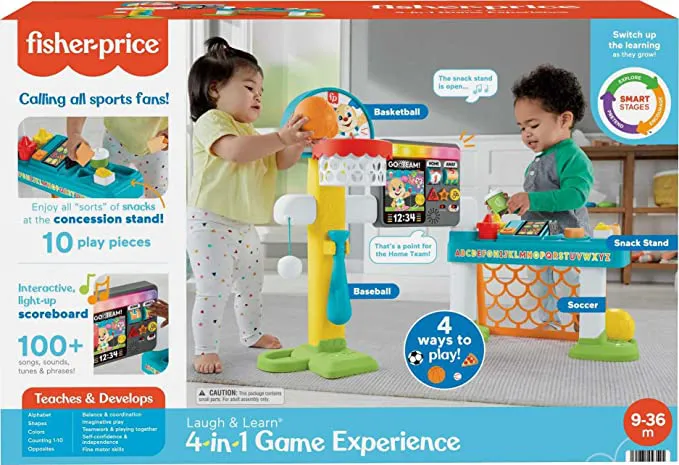 Little athletes can practice all their all-star moves with the Laugh & Learn 4-in-1 Game Experience interactive play set from Fisher-Price. This pretend sports arena lets toddlers shoot basketball hoops, score soccer goals, and hit homeruns with the baseball bat, all in one exciting activity center. Plus, in between ?games,? tiny sports fans can visit the pretend concession stand with removable food pieces for fun role-play or the interactive scoreboard with 100+ songs, sounds and phrases. And with Smart Stages technology, you can switch up the learning level as your mini-MVP grows.