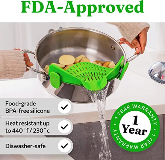 The Kitchen Gizmo Snap N’ strain’s universal design will take the strain out of straining. This top quality heat-resistant, silicone colander is the newest, most practical way to get your food strained thoroughly while avoiding transferring the food out of the pot. The Snap N’ Strain is flexible enough to fit onto nearly all pots, pans, and bowls. It snaps on neatly with two clips. The clips’ strong grip will keep it safely attached while in use and can be left attached to the pot while cooking. Once snapped the pot can be tilted over a sink or bowl and the Snap N’ Strain will do its magic. The liquids will be poured out while the food remains in the pot, even with heavier foods like potatoes.